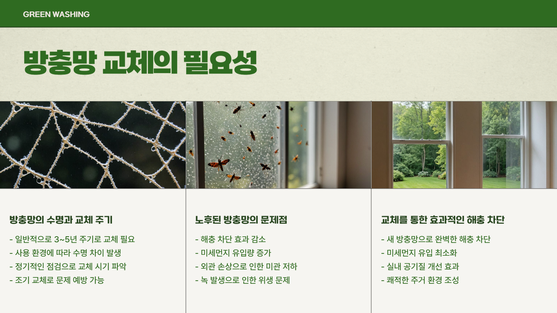 방충망은 일반적으로 3~5년마다 교체하는 것이 좋으며, 사용 환경에 따라 더 짧을 수도 있습니다. 특히 창문을 자주 여닫는 곳이나 바람이 많이 드는 방향에 설치된 방충망은 늘어지거나 찢어지기 쉬우므로 주기적으로 점검하세요. 유지 관리를 위해서는 주기적으로 먼지를 털고 물티슈나 마른 천으로 닦아주는 것이 효과적입니다. 오염이 심할 경우에는 중성세제를 사용해 세척 후 그늘에서 완전히 말리는 것이 좋습니다.